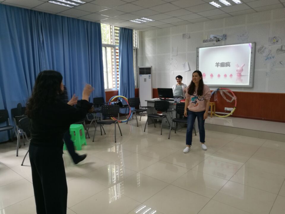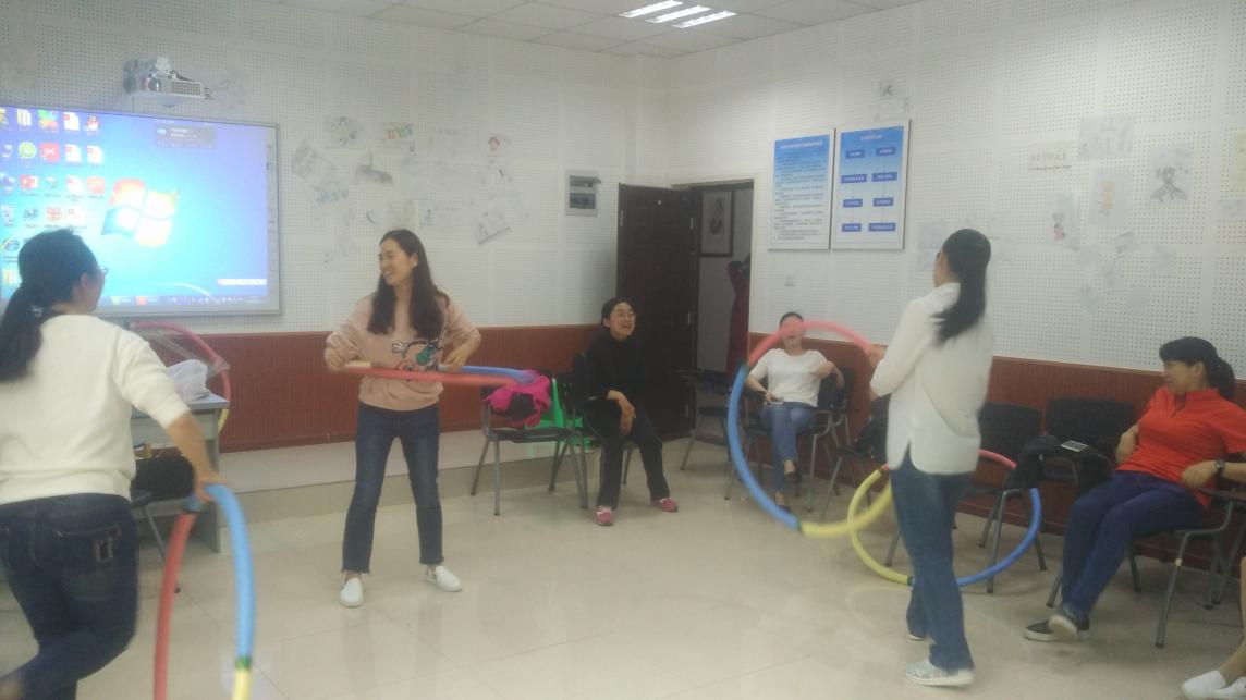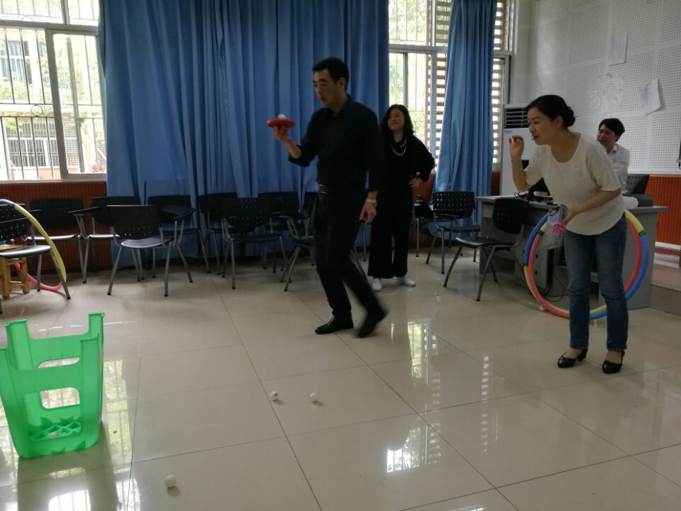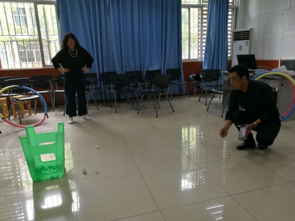 首先是呼啦圈热身,要求采用腰部转动呼啦圈,根据比赛时间长短计时。紧接着是乒乓球投篮。每人有10球的机会,把乒乓球投进塑料垃圾桶中,投篮距离为2米,计算投中的总数。最后有投中5个的,有投中4个的,还有1个的。不管多少,投的过程是充满了欢声笑语。