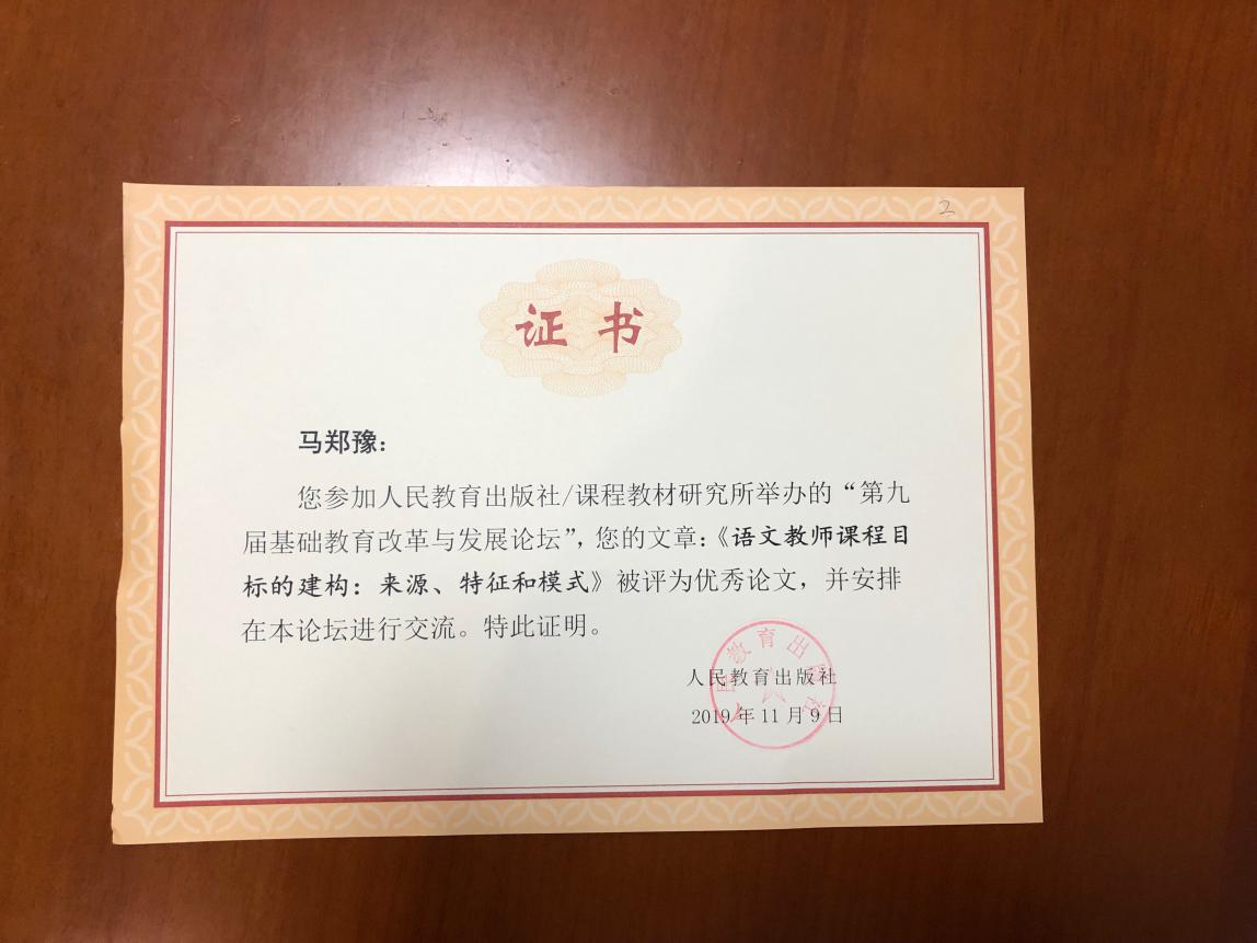 此次会议的主题是“我国基础教育70年:变革与发展”,重点探讨了在我国基础教育的70年发展历程中,小学课程教材教学的变革,中学课程教材教学的变革,以及课程与教学论的发展等专题。成人动漫教师马郑豫博士的论文《语文教师课程目标的建构:来源、特征与模式》,被专家组成员评为“优秀论文”,并被安排在论坛中进行交流。