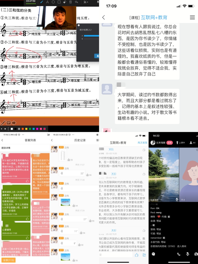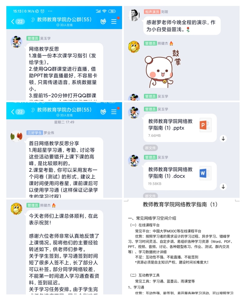 每当结束一天的教学后,老师们都会纷纷来到学院教师群,交流“线上课堂”的心得体会,总结和反思在线教学的得失。比如“准备一份本次课学习指引(发给学生)”、“考勤、讨论等这些活动要错开上课下课的高峰,是比较顺利的。”、“在课件主页 制作一个课程即将开始的页面,提示学生做好上课准备;在课间需要暂停直播的地方最好制作一页提示页,避免学生认为声音中断了。”、“直播课堂互动技巧一:用QQ群课堂直播,可以语音连麦,一个学生分享,其它学生都可以听见,我们就当做是现场,一个学生回答完成,我们可以提问其它学生点评,这样其他学生就必须听课。”“学习通和QQ群并用效果好,在群里用语音交流很顺畅;布置学生到学习通观看录制好的视频,看完后课堂讨论话题,每个人用简短的话留在讨论区,全部有时间记录,因此个人觉得,用了学习通,无需刻意签到。”、“要求学生课上记笔记,课后上传,老师再检查课堂笔记,能有效监督学生学习。”许多老师分享了他们使用在线平台的经验,让大家相互都有很大的收获。