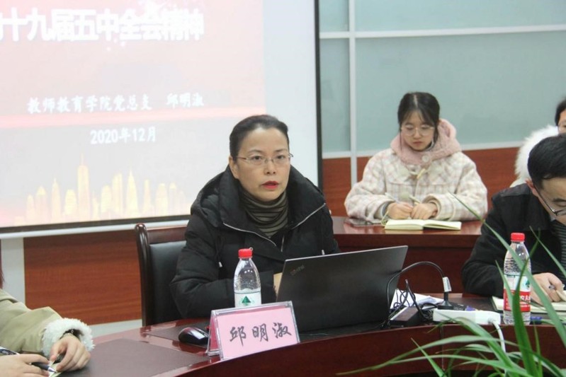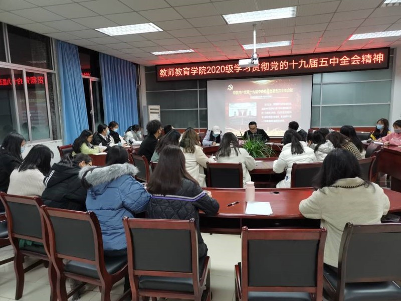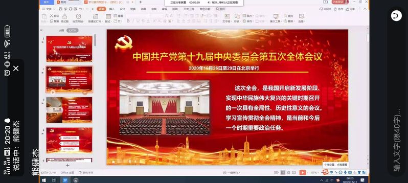 12月11日19时,学院党总支副书记邱明淑面向学院2021届全体团委学生会骨干宣讲党的十九届五中全会精神,学院团学负责人李君主持。