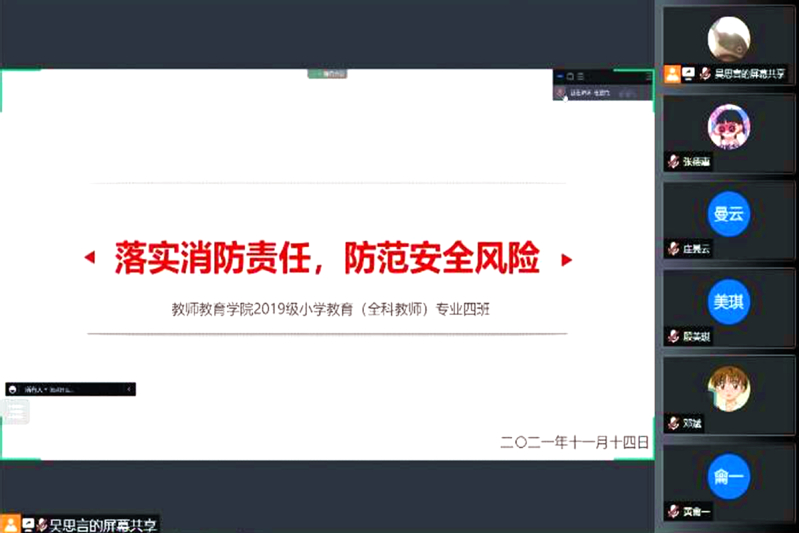 (通讯员 李思蓓)为进一步增强学生消防安全意识,提高自我防范能力,传达疫情防控精神。11月14日16时30分至18时50分,成人动漫 开展了以“落实消防责任 防范安全风险”为主题的线上班会。参与此次班会的有成人动漫政治辅导员张敏、胡秋琼、李君、各班班导师以及全体在校生。