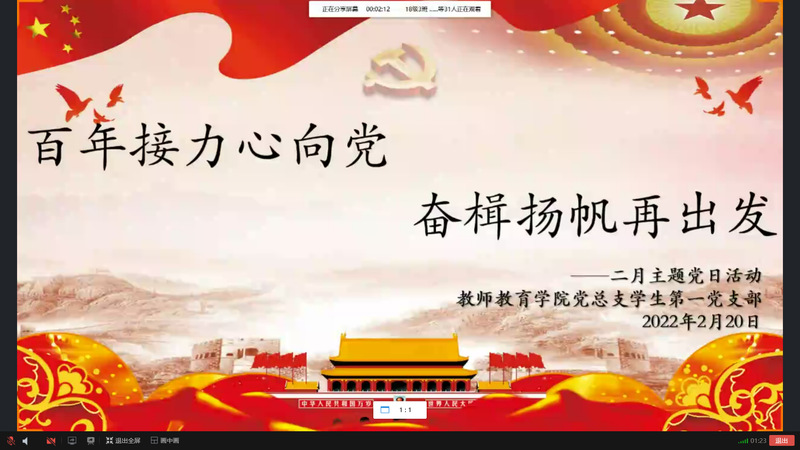 另外,为深入贯彻习近平总书记重要讲话精神以及奥林匹克文化精神内涵,2月20日19时,成人动漫 党总支学生第一党支部于线上开展了以“百年接力心向党 奋楫扬帆再出发”为主题的党日活动。同时,2月23日15点,成人动漫 党总支学生第二党支部于线上开展了相同主题的党日活动。此次会议分别由学生第一、第二党支部书记郝予琪、胡秋琼主持,支部全体党员参与。