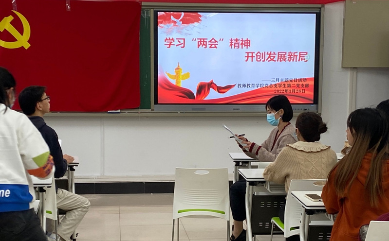 3月28日15时,教师技能与心理学党支部于崇仁楼408会议室开展了以“学习‘两会’精神,开创发展新局”为主题的党日活动。此次会议由支部书记苏志强主持,支部全体党员同志参加。同时,教育学学科组党支部于崇仁楼203开展此次主题党日活动。此次会议由支部书记蹇世琼主持,支部全体党员同志参会。3月28日18时20分,学生第二党支部于崇仁楼303开展此次主题党日活动。此次会议由支部书记胡秋琼主持,学生第二党支部全体党员参加。3月31日,学生第一党支部于崇仁楼106开展此次主题党日活动。此次会议由支部书记郝予琪主持,学生第一党支部全体党员参加。