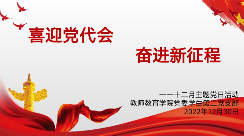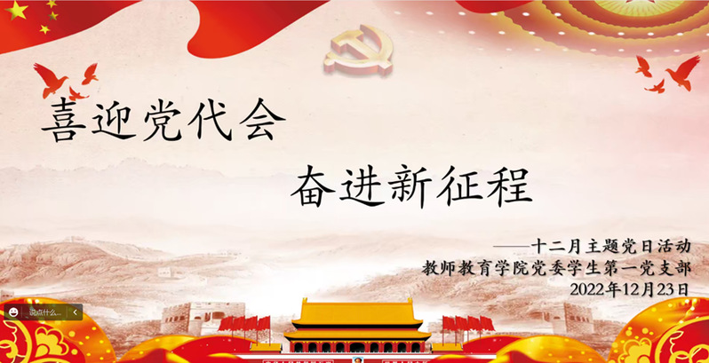 12月26日19时成人动漫 教育学学科组党支部特在线上开展了“矢志不忘奋斗路 接续赶考新时代”十二月主题党日活动。此次会议由支部书记蹇世琼主持,支部全体党员参加。同时,成人动漫 教师技能与心理学党支部在线上开展了十二月主题党日活动。此次会议由支部书记苏志强主持,支部全体党员参加。12月23日19时,成人动漫 党委学生第一党支部于腾讯会议开展了以“喜迎党代会 奋进新征程”为主题的党日活动。此次会议由支部书记李君主持,学生第一党支部全体党员参加。12月30日20时,成人动漫 党委学生第二党支部于腾讯会议开展了以“喜迎党代会 奋进新征程”为主题的党日活动。此次会议由支部书记陈红主持,学生第二党支部全体党员参加。