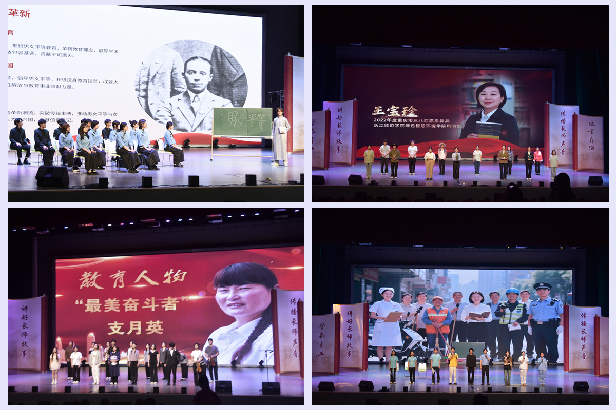 从“中国最美乡村女教师”张桂梅的感人事迹,到刘玲俐老师数十年如一日帮助听障孩子学习开口说话的故事;从陶行知先生烽火中的教育坚守,到“悬崖上的校长妈妈”支月英;从传媒学院李栋老师危急时刻的凡人善举,到绿色智慧环境学院王宝珍老师用科研数据守护碧水蓝天的点滴……这些故事里有长师人精神的缩影,更是对新时代教育者风采的生动诠释。