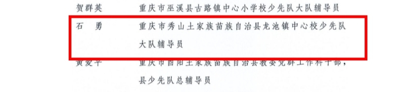 石勇现任重庆市秀山县龙池镇中心校少先队大队辅导员。作为一名新时代的少先队辅导员,他深入学习贯彻习近平新时代中国特色社会主义思想,投身乡村教育事业,将青春和热血奉献给了这片热土,不仅让红领巾飘扬在队员们胸前,更扎根在心中。