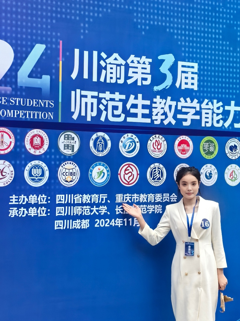 何鑫,女,成人动漫 小学教育(全科教师)专业2024届学生,校级优秀毕业生。曾荣获国家级语文微格教学论坛暨第十二届“华文”高校语文教育专业师范生教学技能测试一等奖;国家级语文微格教学论坛暨第十二届“华文”高校语文教育专业师范生教学设计能力测试二等奖;省部级“重庆市第十四届大学生心理成长论坛”心理成长微课比赛一等奖;省部级中国大学生计算机设计大赛从重庆市级赛三等奖;省部级第八届“重庆好老师”演讲比赛三等奖;校级成人动漫 2022年大学生志愿者暑期“三下乡”社会实践活动优秀个人荣誉称号;校级2023年度成人动漫 “优秀共青团员”荣誉称号;校级2021—2022学年度“十佳百优”志愿服务活动先进个人荣誉称号;在校期间,荣获4次等级奖学金