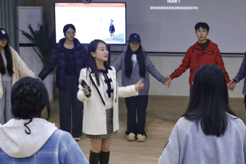 最后,她指引同学们用响指模拟雨滴,用跺脚演绎雷鸣,让同学们在身体与音乐的共振中深刻体会情绪的表达与释放,进一步强化了以音乐为媒介缓解情绪的活动成效。