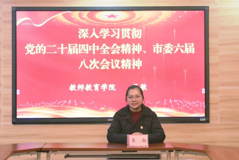 活动伊始,吴敏书记围绕党的二十届四中全会与市委六届八次全会关于教育的相关部署,深入阐述其与教育家精神的内在契合。她结合当代青年使命要求,对同学们提出要求:一要锚定政治方向,融入发展大局,深刻领会教育作为“强国建设、民族复兴之基”的战略定位,将个人理想与教育事业发展、教育强市建设目标紧密结合。二要聚焦育人赛道,蓄力储备本领,牢记“为党育人、为国育才”的初心,在专业学习与实践锻炼中打牢教育理论和技能基础。三要勇担青年责任,主动担当作为,立足时代发展需求,以实际行动助力教育高质量发展与共同富裕。她号召同学们要以全会精神为指引,践行教育家精神,将青春之力投入教育强国建设伟大征程。
