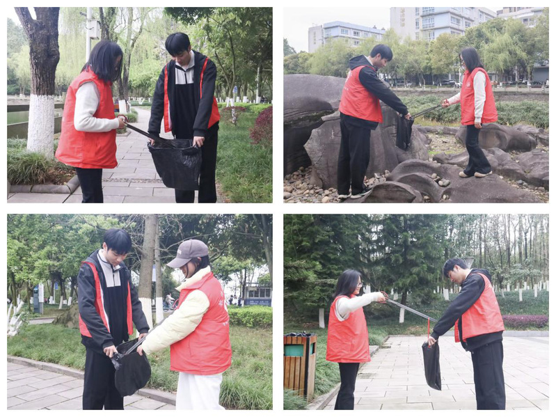 本次活动中,同学们分为不同小组,拿着钳子与垃圾袋,身穿志愿服装分散开展垃圾清除工作。志愿者们的身影在校园中穿梭,将道路旁、假山下、落叶中等一系列隐蔽位置的垃圾细致清扫出来,在劳动中践行了绿色环保理念。在志愿者的辛勤劳动下,鉴湖恢复了整洁和秩序,让校园充满活力。