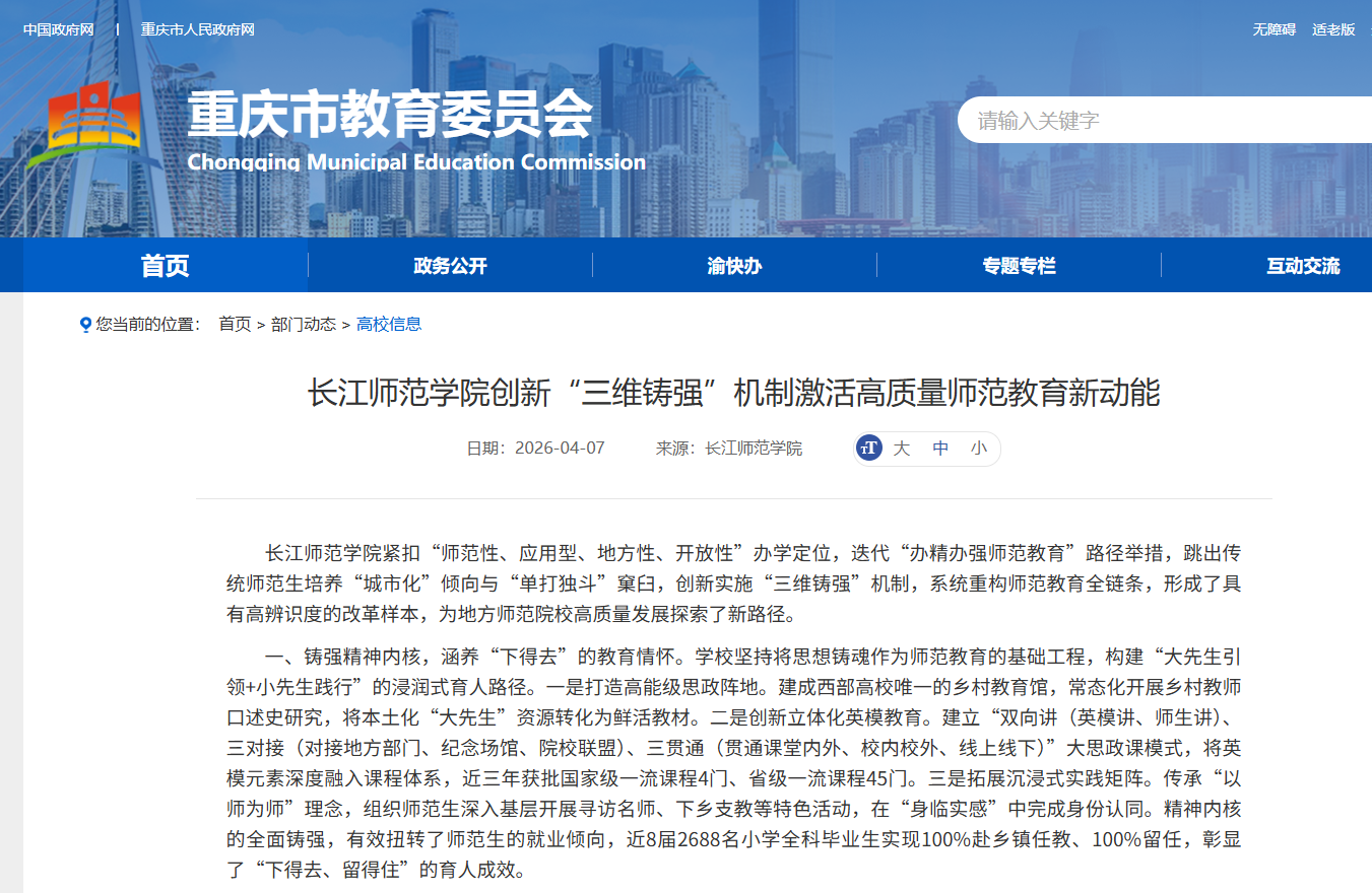 近日,重庆市教育委员会官网以《成人动漫 创新“三维铸强”机制激活高质量师范教育新动能》为题,宣介我校办精办强师范教育的主要经验做法。