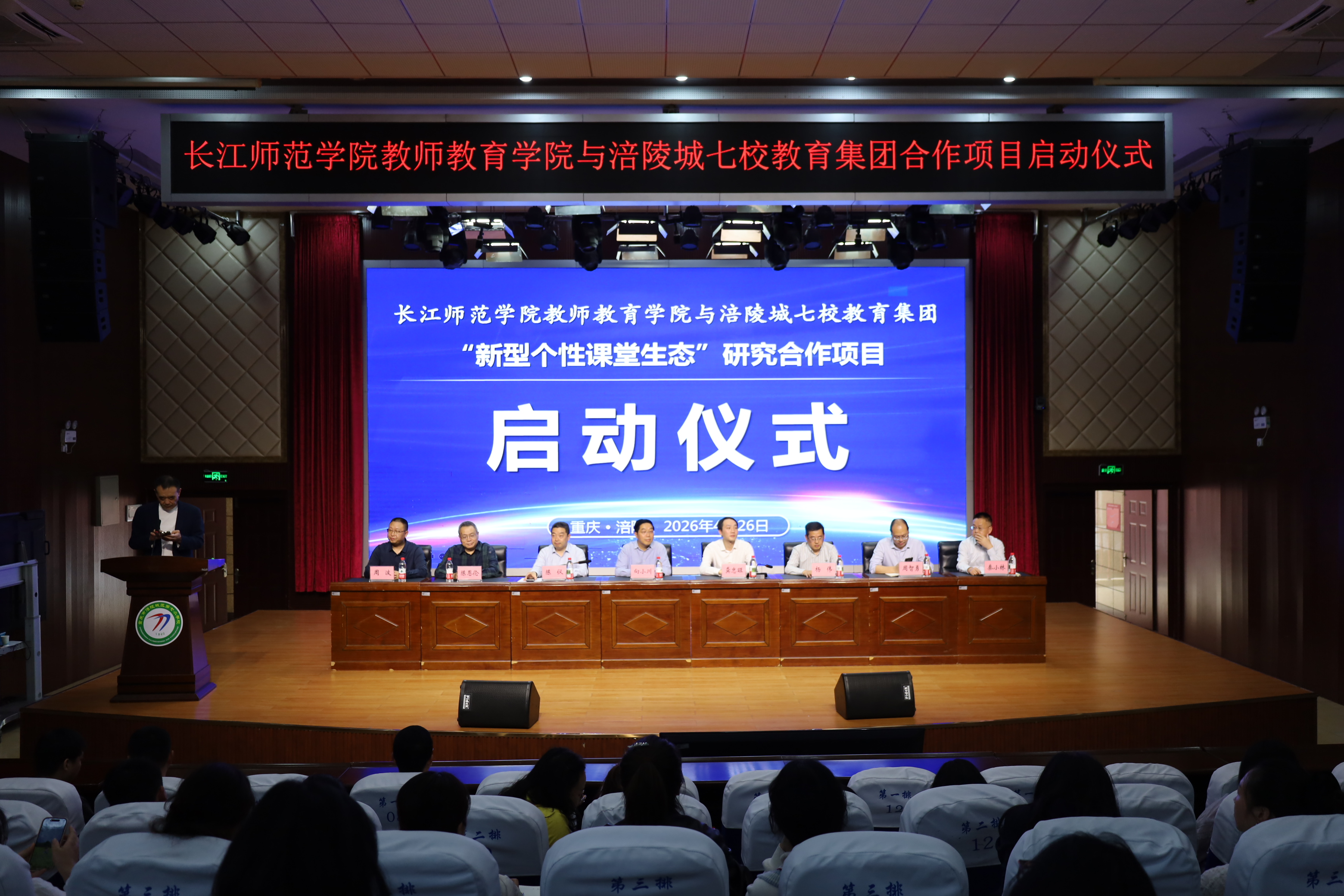 4月26日,我院与涪陵城七校教育集团“新型个性课堂生态”合作项目启动仪式在重庆市涪陵城七校兴涪校区举行。学校党委副书记向小川、涪陵区教委总督学陈仪等领导出席仪式并讲话,学院党政班子成员、涪陵城七校教育集团全体教师参加仪式。学校基础教育研究院院长庞健主持仪式。