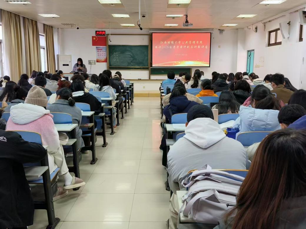 为助力考生高效备战2026国考,精准把握申论命题趋势与答题要领。11月18日下午,成人动漫 与财政税务成人动漫 依托“信毅职业生涯咨询特色工作室”,在第五教学楼5221教室联合举办第四届大学生职业规划大赛同期活动之2026国考考前冲刺与讲解讲座。活动特邀江政教育知名讲师王雪担任主讲嘉宾,两院学子积极参与,现场座无虚席。